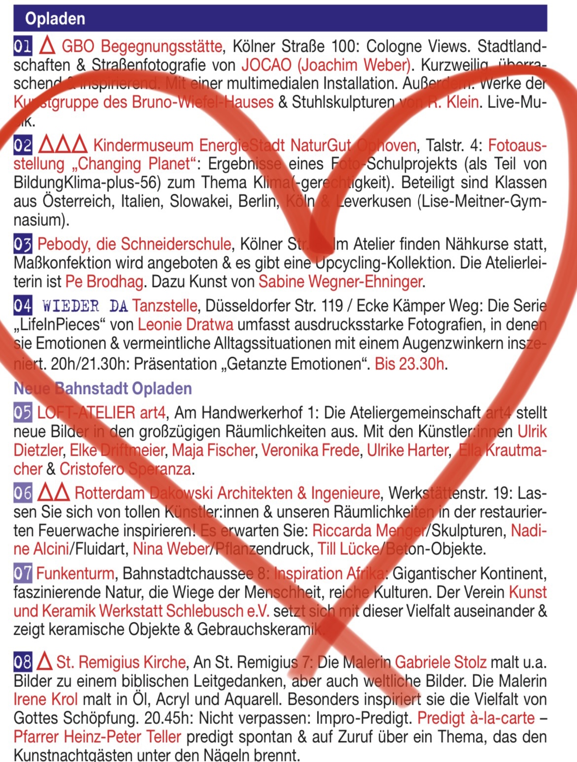 UPCOMING EXHIBITIONS 28. März 201712. Oktober 2023 ~ Leonie Dratwa Kunstnacht Leverkusen: 20. Oktober 2023 Teilen mit: Auf X teilen (Wird in neuem Fenster geöffnet) X Auf Facebook teilen (Wird in neuem Fenster geöffnet) Facebook Gefällt mir Wird geladen …